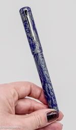 This project started a year ago when I first saw Franklin-Christoph's use of M3 (Macro Molecular Metal) on their pens. This material a urethane material bonded to metals, and it gives the pens a different feel than standard resins. It's more like ebonite, and it's a tiny bit heavier than standard resins (but not enough to make a huge difference). The purple is dyed aluminum, and the silver is un-dyed aluminum. Wild, right?